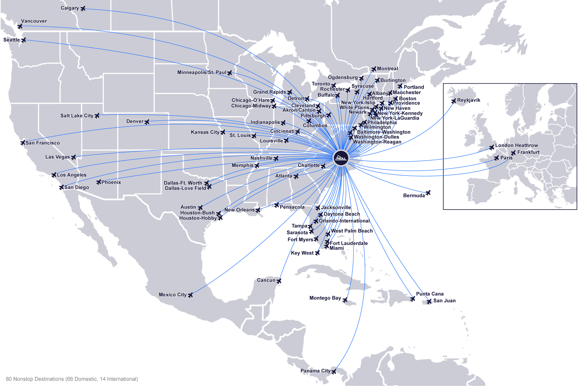 A map showing routes and nonstop destinations in North America, Mexico, Panama, the Caribbean and Europe